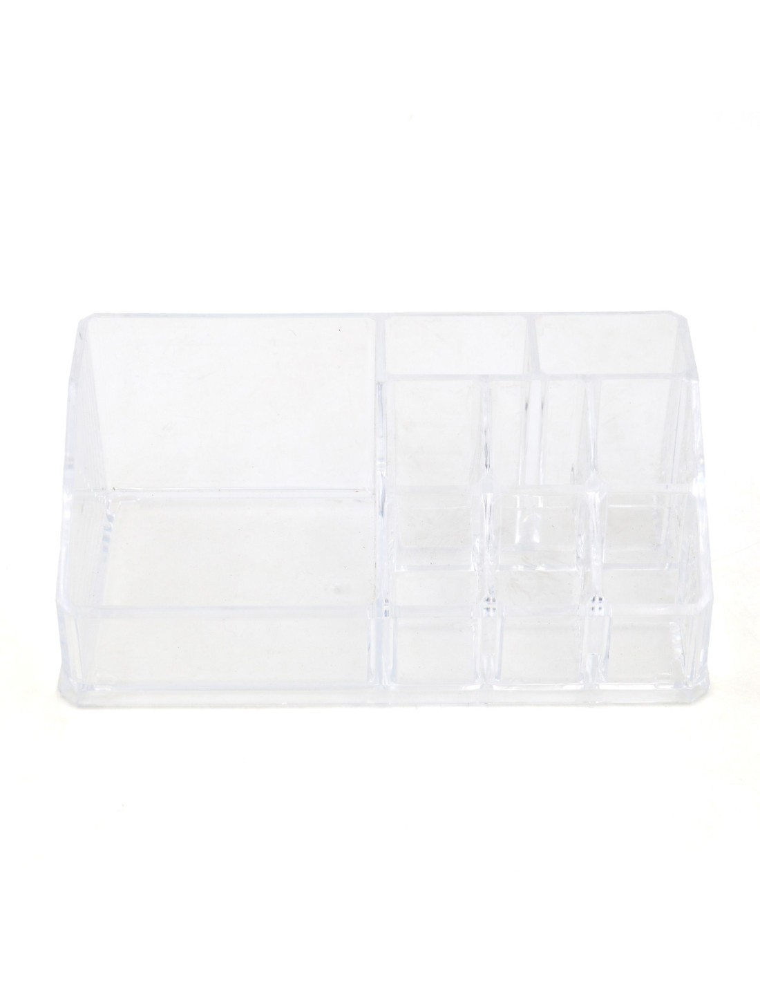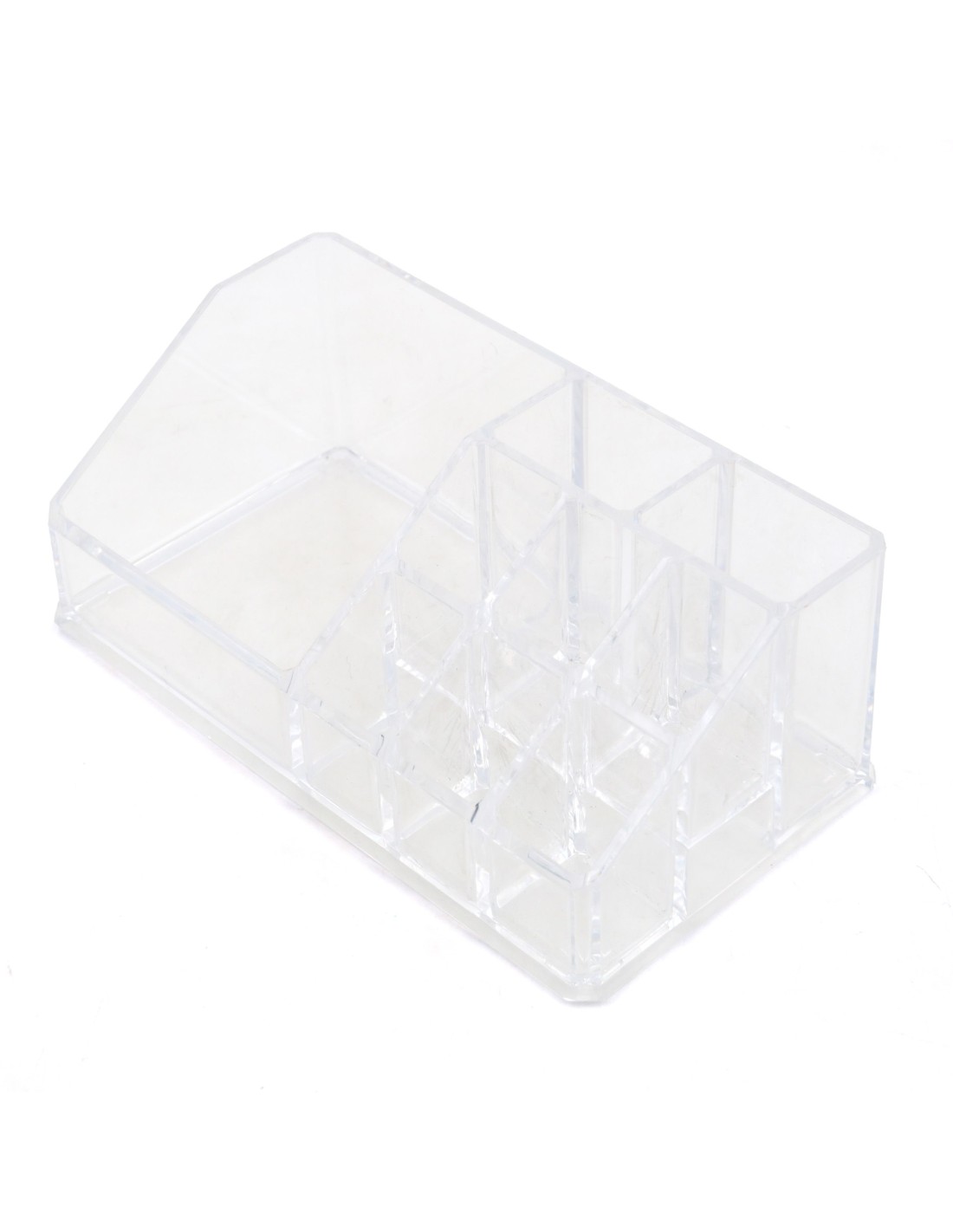 Cet organisateur de maquillage en PS (polystyrène) cristal épais transforme le désordre en une présentation digne d'un étalage de boutique. Ses 9 compartiments de tailles et de hauteurs variables, disposés en escalier, permettent de ranger et de visualiser d'un coup d'œil tous vos essentiels : flacons de fond de teint, rouges à lèvres, pinceaux, eye-liners, palettes et petits accessoires. La transparence totale et les angles arrondis lui confèrent un aspect moderne et sécurisé, tandis que sa construction robuste assure une stabilité parfaite. Idéal pour garder votre plan de travail ordonné et gagner du temps le matin.