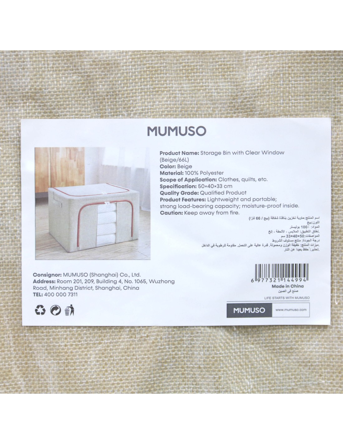 La Storage Bin avec Fenêtre Transparente – 66L est la solution idéale pour organiser efficacement votre intérieur tout en gardant une visibilité immédiate sur son contenu. Conçue en polyester 100 %, elle est à la fois légère, résistante et durable, parfaite pour un usage quotidien.