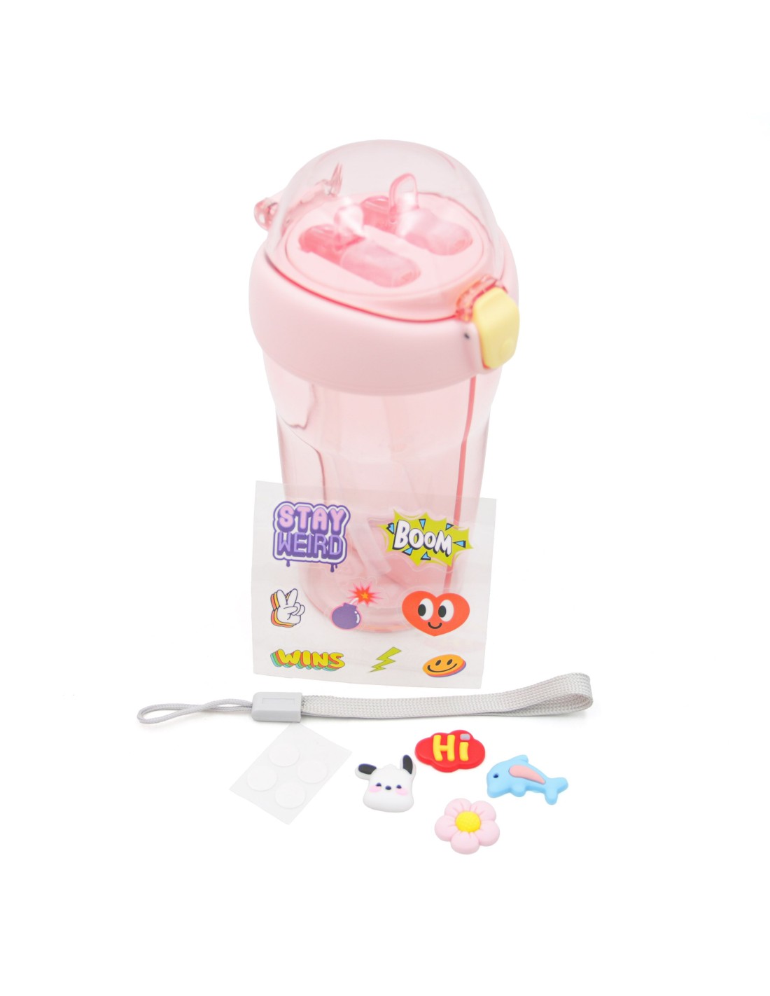 Mais ce n'est pas tout ! Cette gourde est aussi un terrain de jeu créatif. Elle est livrée avec des stickers colorés pour la personnaliser à votre goût, ainsi que de petites décorations en silicone à fixer sur le bouchon ou la paille pour lui donner une touche unique et ludique. Et pour la transporter encore plus facilement, un cordon de transport (ficelle grise avec anneau) vous permet de la porter en bandoulière, en main ou de l'accrocher à votre sac.