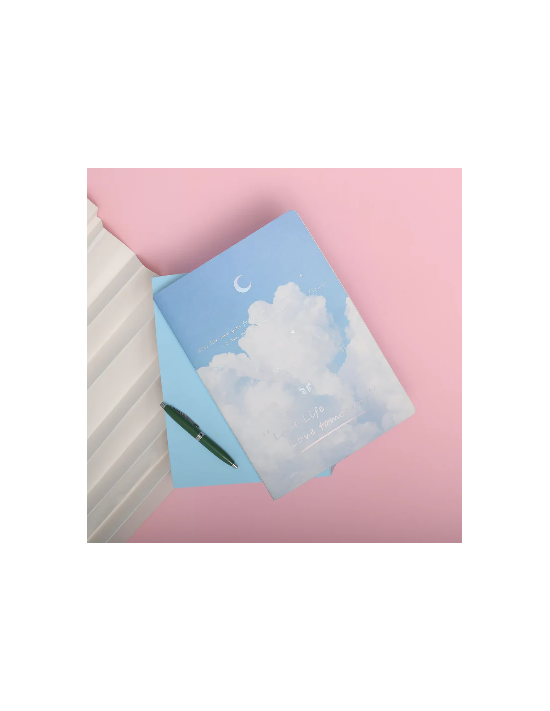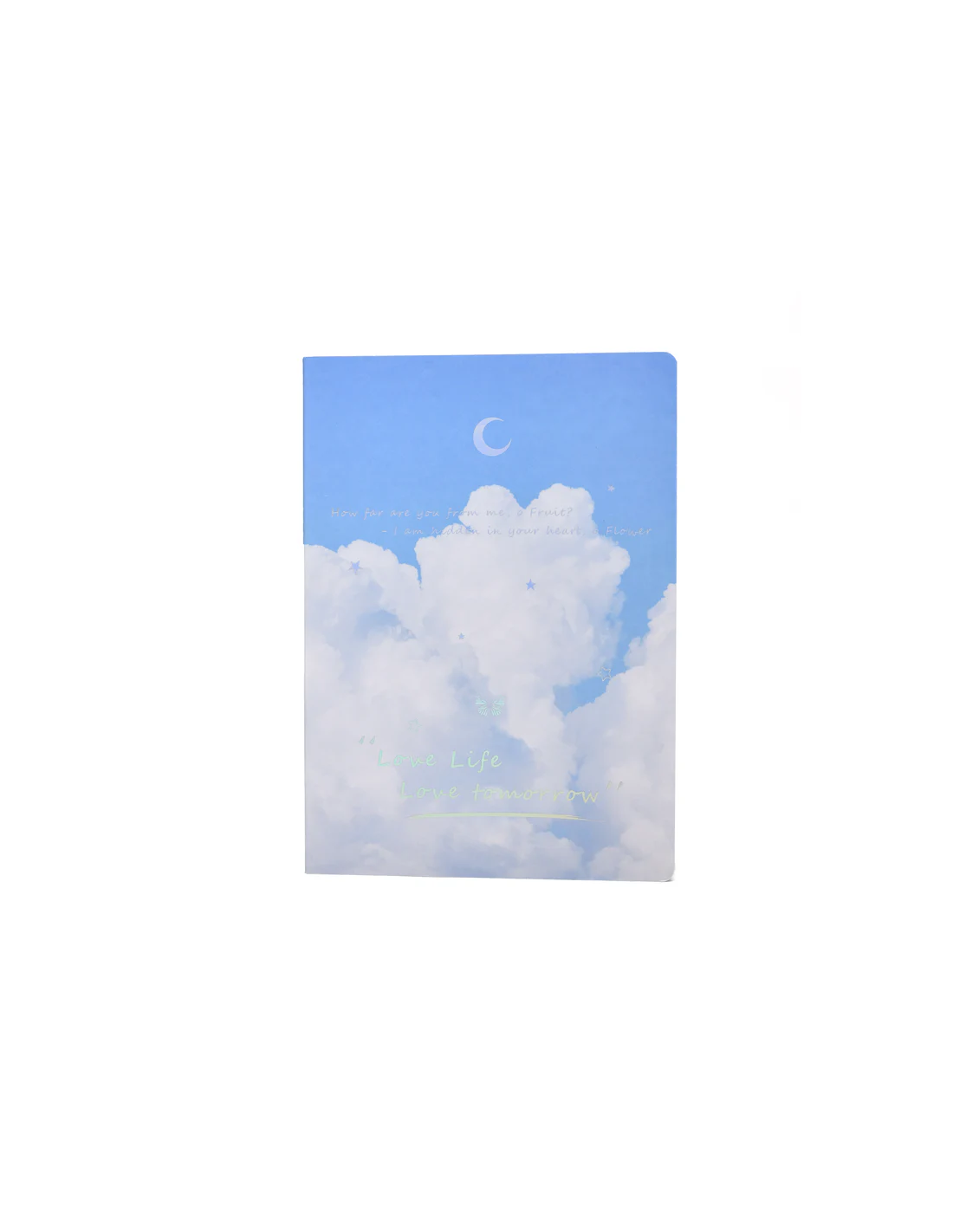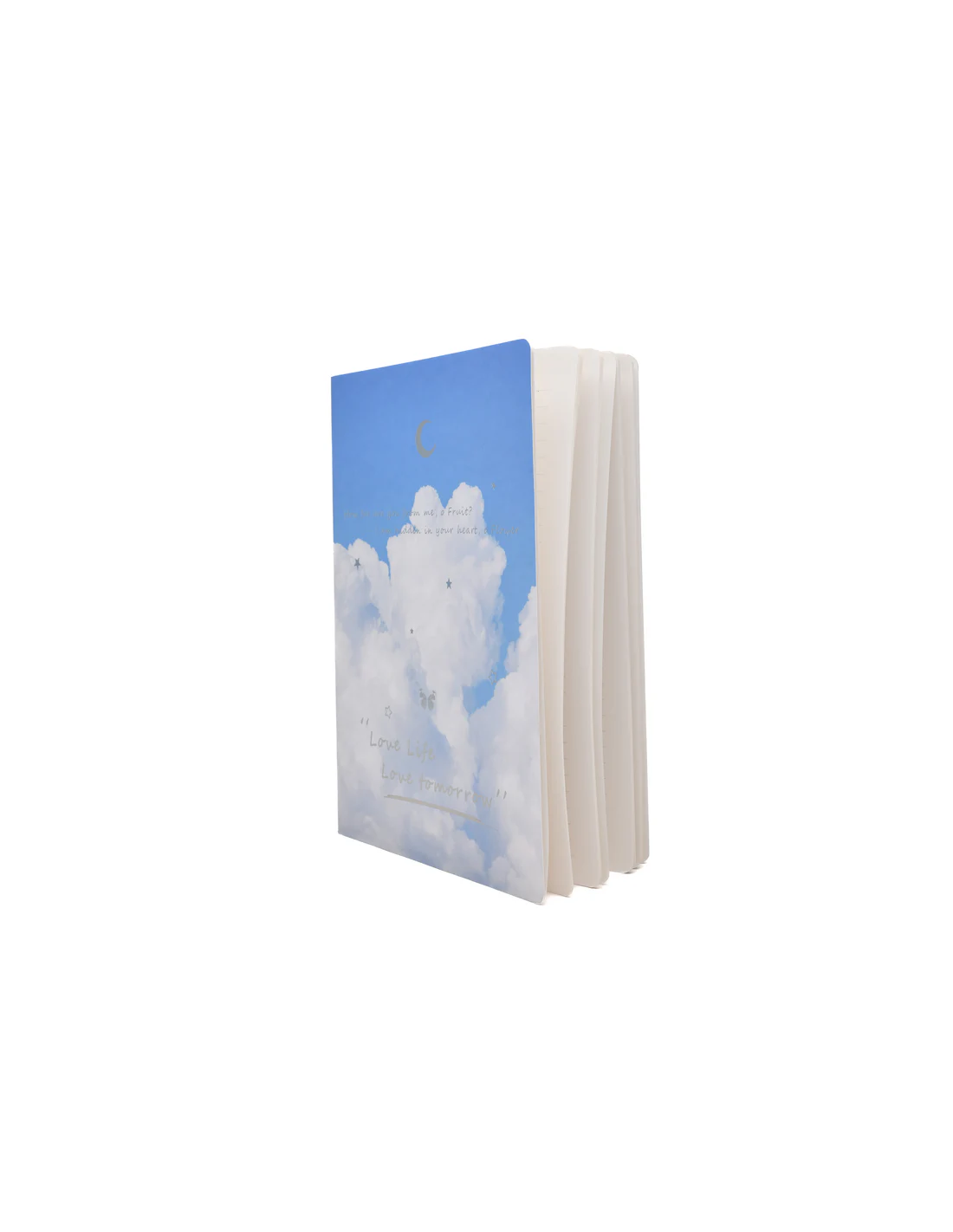 Notre carnet de notes, 183 x 257 mm, est parfait pour capturer vos idées, croquis et réflexions au quotidien. Il combine une reliure cousue en fil blanc, des pages écrues lignées et une couverture bleu ciel ornée de nuages et de douces phrases poétiques, faisant de ce carnet votre compagnon idéal pour toutes vos notes, personnelles ou professionnelles.