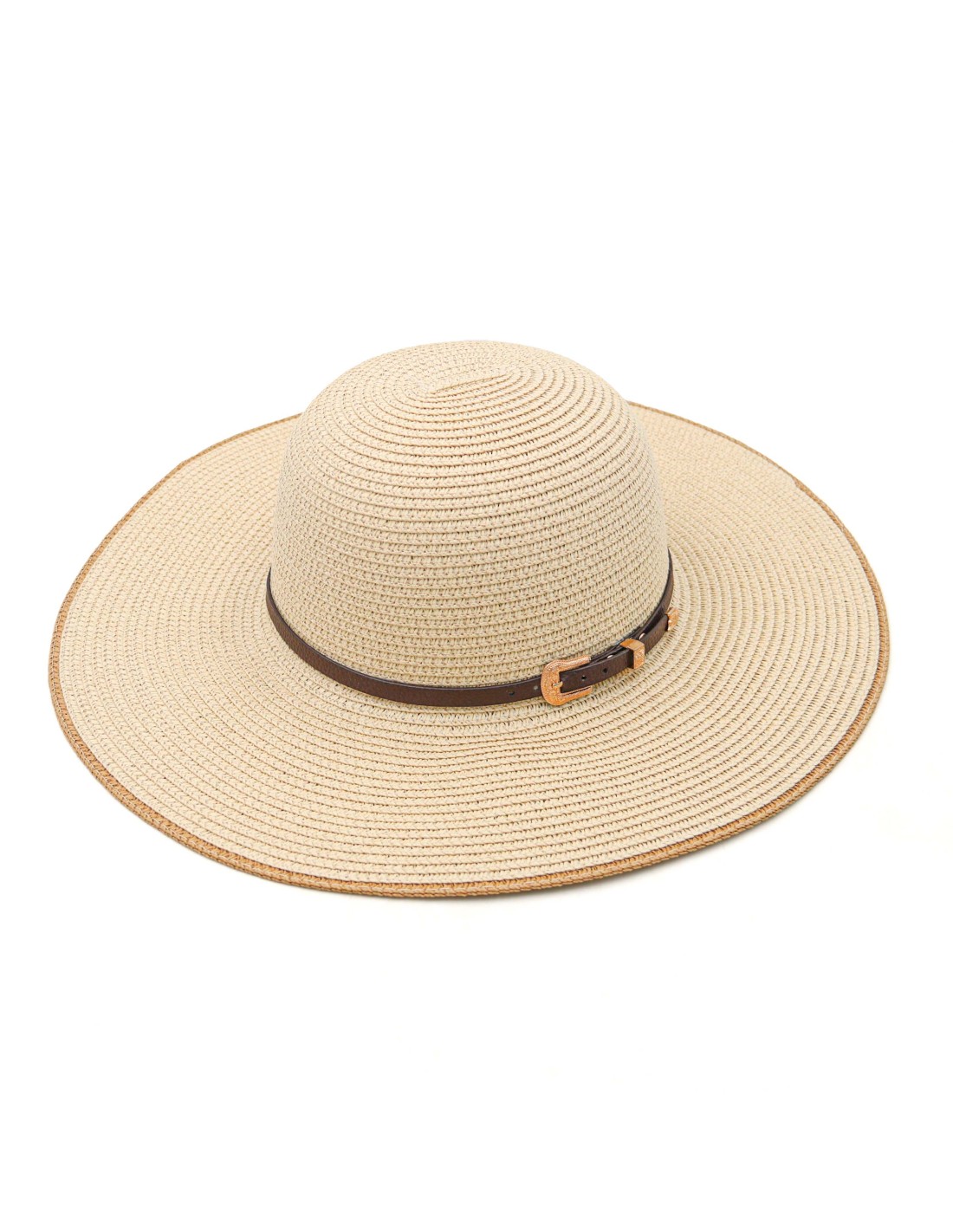 Chapeau de Paille à Large Bord avec Lanière en Cuir (Beige)