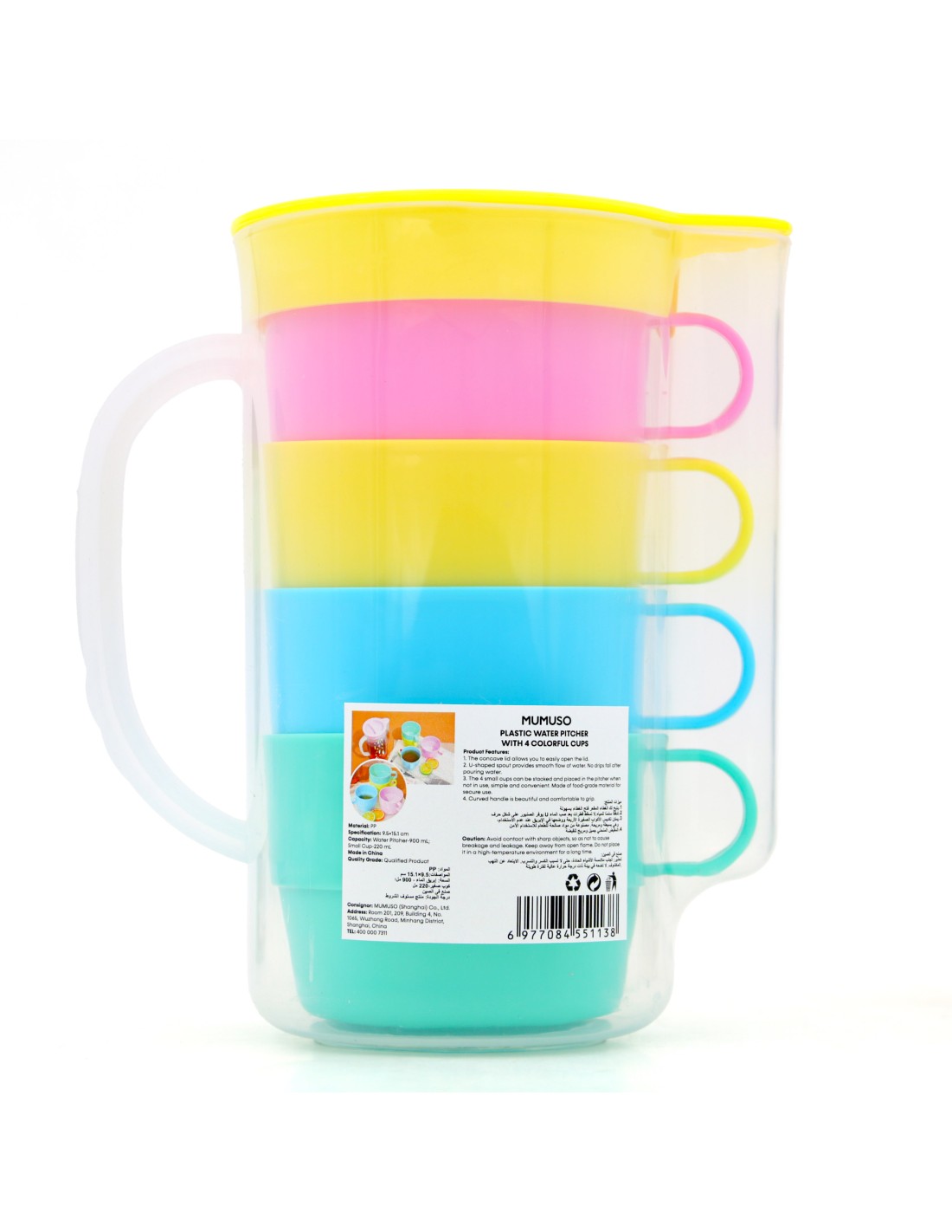 Conçue pour allier praticité et convivialité, cette carafe de 900 ml en PP alimentaire séduit par son design pensé pour le quotidien. Son bec verseur en forme de U garantit une coulée précise et sans gouttes, tandis que son couvercle concave s'ouvre et se referme aisément d'une seule main. La poignée courbée épouse parfaitement la main pour un versement confortable et sécurisé. Les 4 verres colorés de 220 ml chacun s'emboîtent astucieusement et se rangent à l'intérieur de la carafe lorsqu'ils ne sont pas utilisés, optimisant ainsi l'espace de rangement. Un ensemble sans BPA, facile à nettoyer et idéal pour servir eau, jus ou boissons fraîches.
