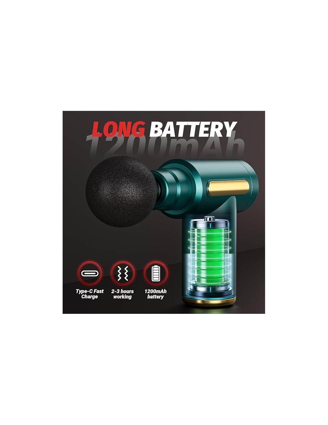 Choisissez la tête adaptée à la zone à masser. Appuyez sur le bouton pour démarrer. Glissez doucement le pistolet sur la zone douloureuse sans rester plus de 30 secondes au même endroit. Rechargez via câble USB (non inclus). Ne pas utiliser pendant la grossesse ni sur les enfants. Éviter l’eau et l’humidité.
