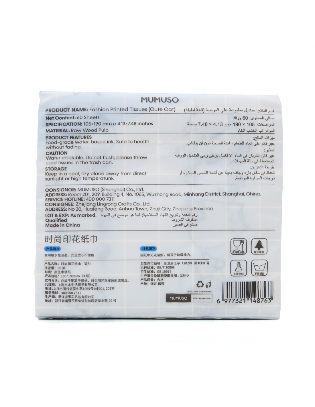 Mouchoirs Imprimés Fashion MUMUSO - Chat Mignon (60 Feuilles)
