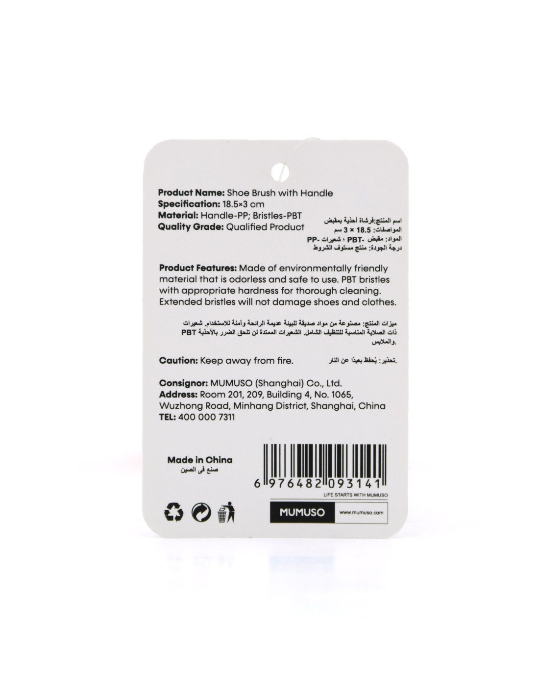 Conçue pour un entretien en toute sécurité, cette brosse à chaussures allie robustesse et douceur. Son manche long en PP offre une prise en main ferme et confortable pour un brossage précis sans se baisser. Les poils en PBT (Polybutylène Téréphtalate) sont suffisamment fermes pour décrocher la boue séchée et la poussière incrustée, mais suffisamment doux et flexibles pour préserver la surface délicate du cuir, du daim, du tissu ou des matières synthétiques de vos chaussures, baskets et vêtements. Compacte et légère, elle trouve facilement sa place dans votre entrée, votre placard ou votre valise pour un nettoyage rapide avant de sortir.