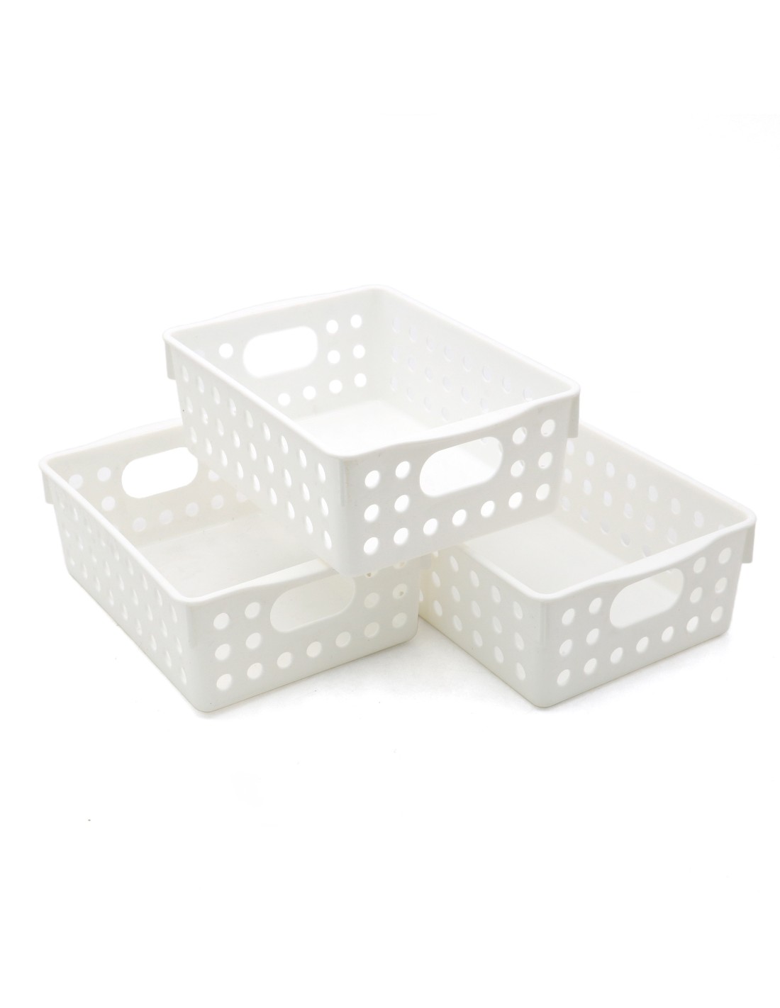 Apportez une touche d'ordre moderne à votre bureau, étagère ou commode avec ce trio de paniers de rangement polyvalents. Leur structure en PP robuste et ajourée assure une parfaite circulation de l'air, prévenant l'humidité et les odeurs pour un stockage sain. Les poignées latérales ergonomiques facilitent le transport d'un poste à l'autre, tandis que leurs bords arrondis garantissent une manipulation sûre et agréable. Avec leurs dimensions compactes (17.3x12x5.8 cm), ils sont parfaits pour classer vos fournitures de bureau, produits de beauté, petites pièces de bricolage ou même fruits et légumes dans la cuisine.