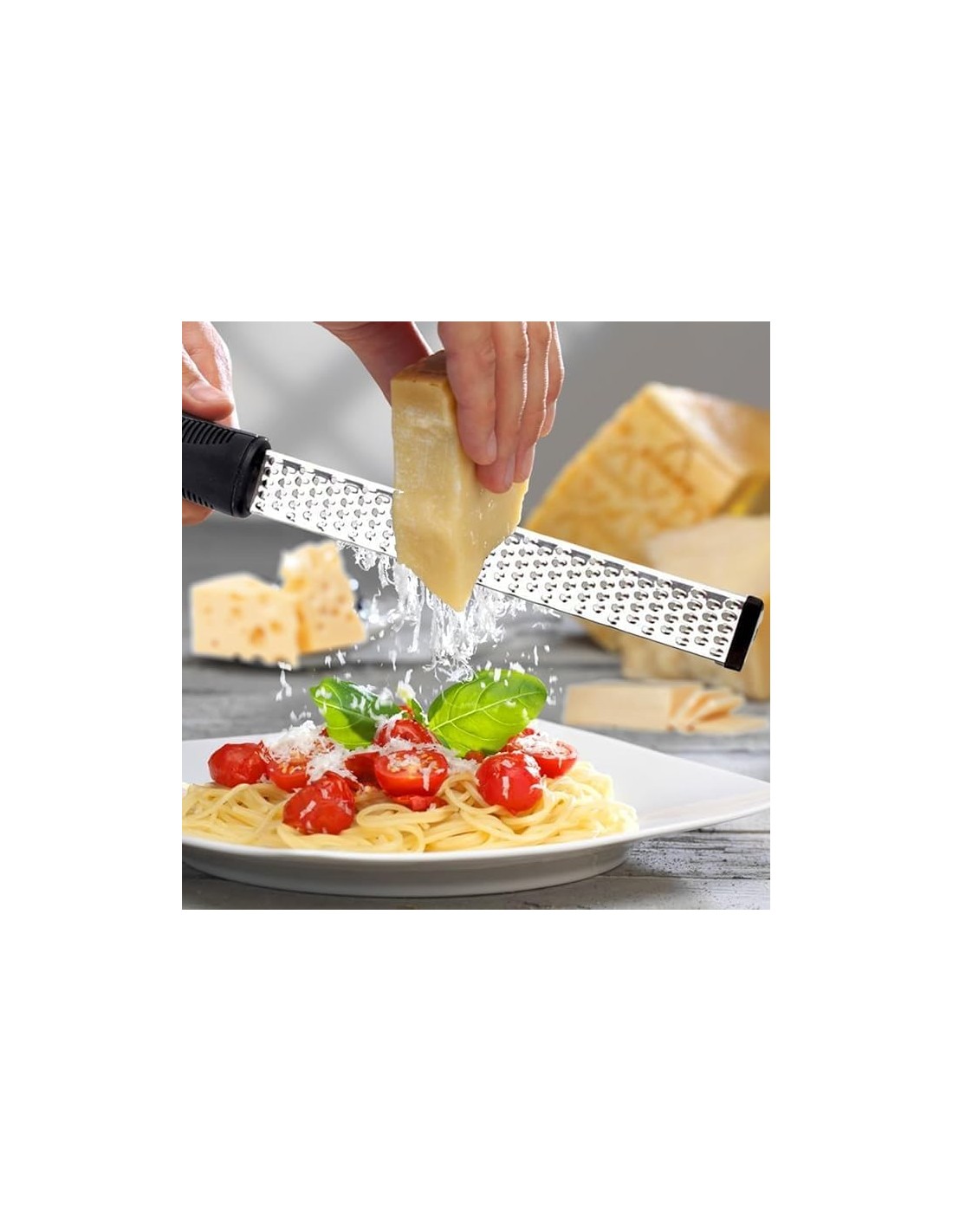 Cette nouvelle version, dotée d'un manche doux au toucher et de languettes anti-rayures, râpe même le Parmesan Reggiano le plus dur, ainsi que d'autres fromages durs, en fines lamelles. Idéal pour garnir vos spaghettis et boulettes de viande préférés ou une salade. Il est également parfait pour zester les agrumes sans effort afin d'ajouter des saveurs naturelles à une crème brûlée, un gâteau ou à une vinaigrette.