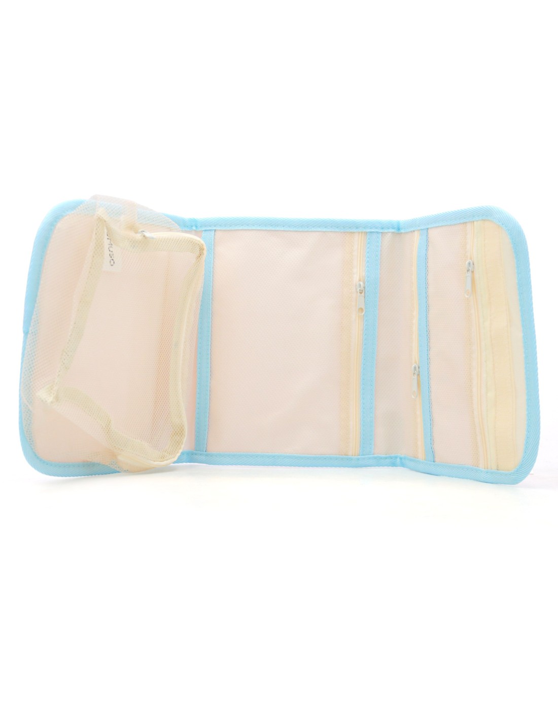 Dotée de plusieurs compartiments zippés, avec des poches en filet respirant, cette trousse permet de séparer efficacement maquillage, soins du visage, accessoires ou produits d’hygiène. Son design pliable permet de gagner de la place dans une valise ou un sac, tandis que son format suspendu facilite l’accès rapide aux produits.