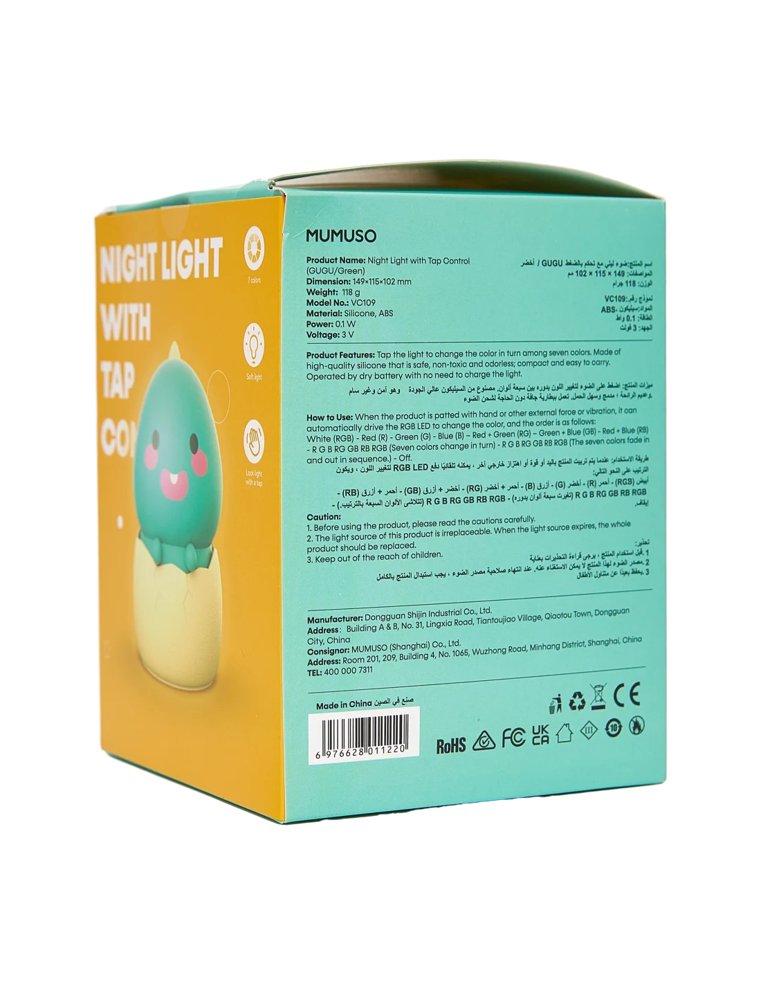 Illuminez votre espace avec la veilleuse tactile en forme de Gugu, fabriquée en silicone de haute qualité, sûre, non toxique et sans odeur, compacte et légère, facile à transporter partout. Gugu, un dinosaure au caractère naïf, à la fois adorable et obstiné, capable d'être taquin qui d'un simple toucher, vous permet de changer la couleur parmi sept choix différents : blanc, rouge, vert, bleu, rouge+vert, vert+bleu, rouge+bleu, alimentée par des piles sèches, ne nécessite aucune recharge, un compagnon parfait pour une ambiance apaisante et colorée !